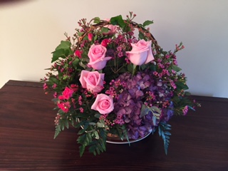 Thank you very much for the lovely basket of flowers. The picture does not do the arrangement justice, but it is an absolutely beautiful arrangement of large pink roses, dark pink tea roses, purple hydrangeas, small delicate purplish/pink flowers, and greenery including ivy wrapped around the handle of the basket. It brightens my spirits as well as the entire open area of our home downstairs and is a constant reminder of you and your thoughtfulness.